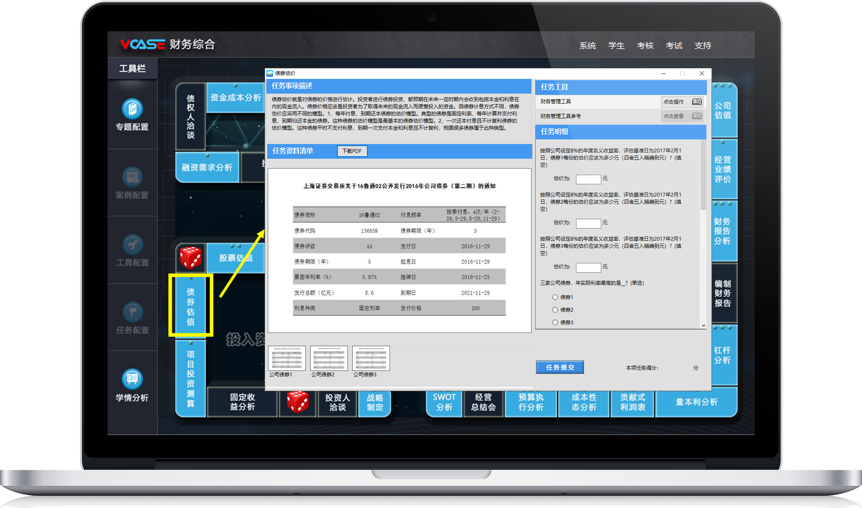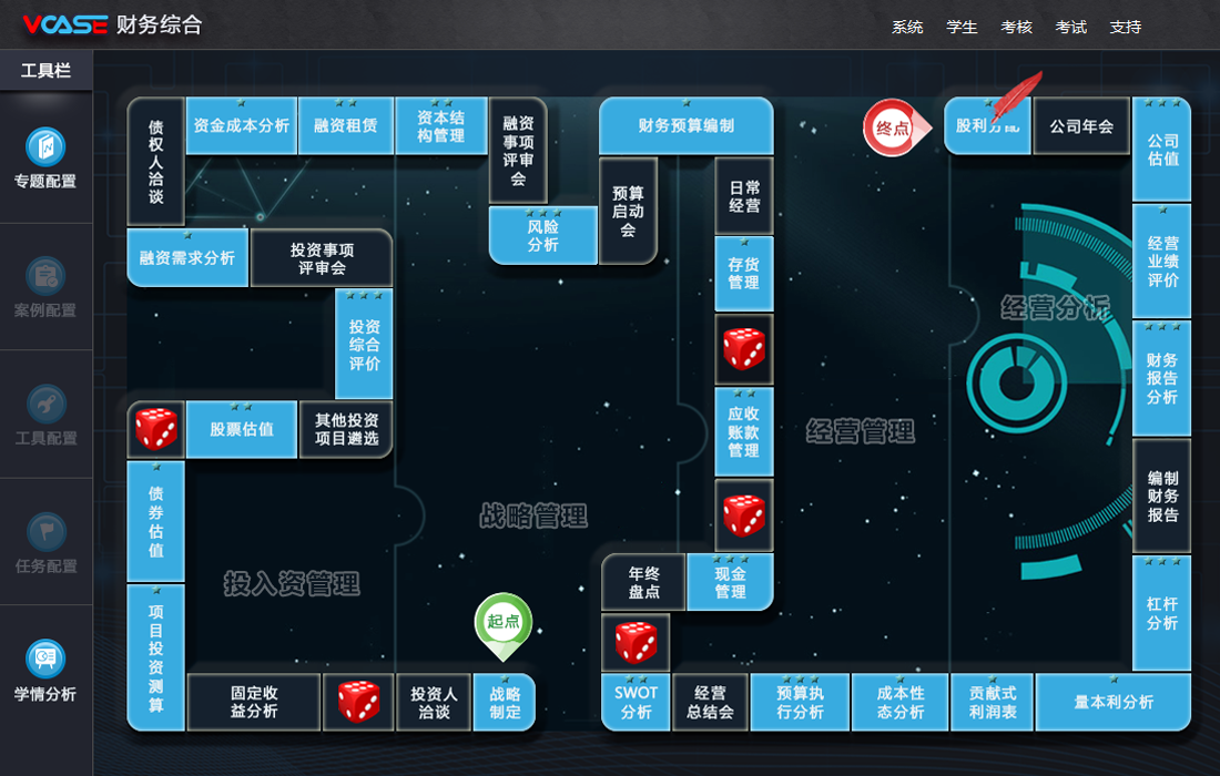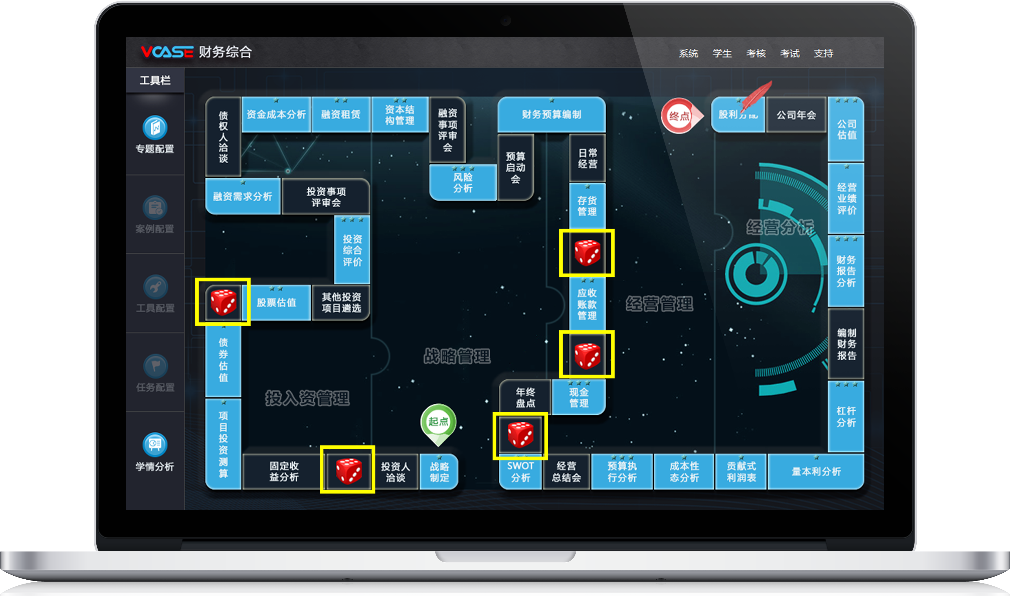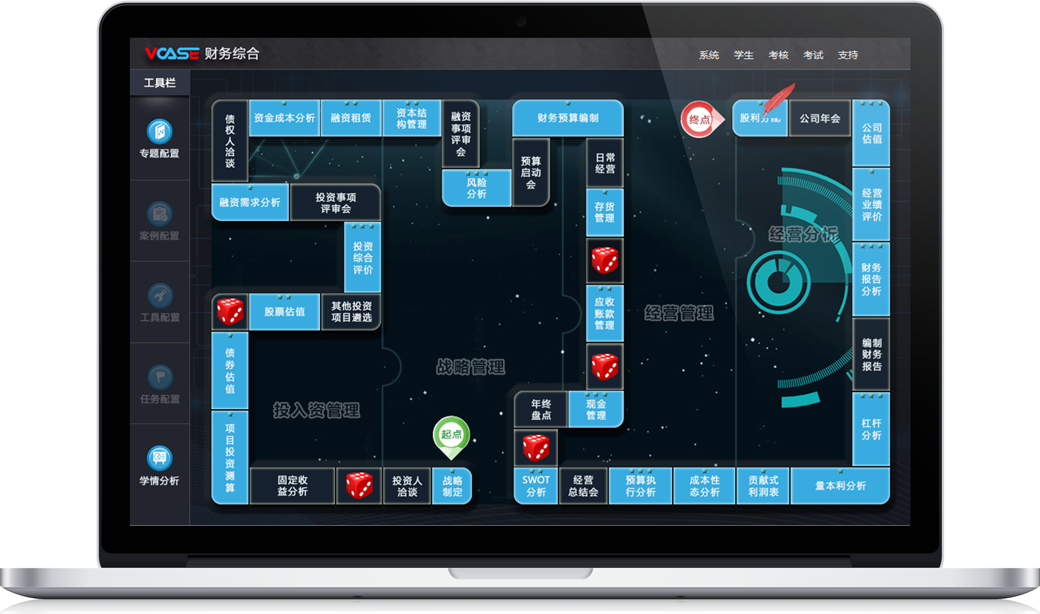 VCase财务综合,是一个以企业价值创造为主线,从制定发展战略(起点)到股利分配(终点),模拟财务管理、管理会计、财务分析知识综合运用和决策过程的软件平台。